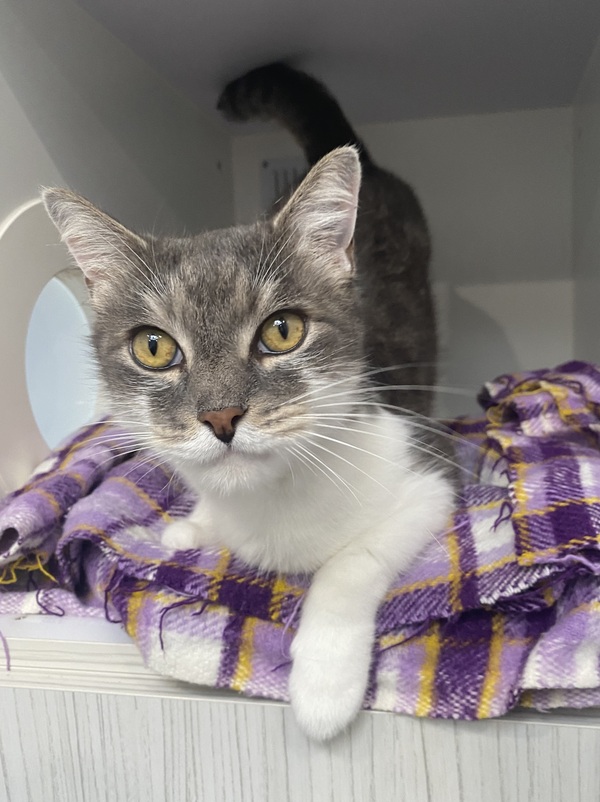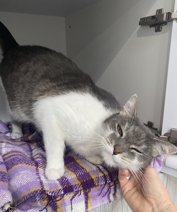 Tao has a beautiful light grey tabby and white coat and a calm, gentle presence. He's patiently waiting for a kind new owner to take him home, where he can enjoy his twilight years in peace and comfort.
