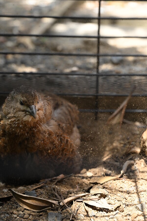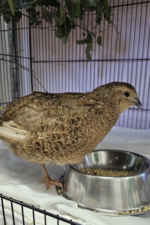 Ducky would thrive in a secure predator-proof yard pen with plenty of space to roam, ability to be protected from the elements, some loose dirt available for dust-bathing, and low shelters or plants to help him feel safe. Because Japanese quail can jump surprisingly high - often straight up several feet if startled - it's ideal for his enclosure to be netted in.