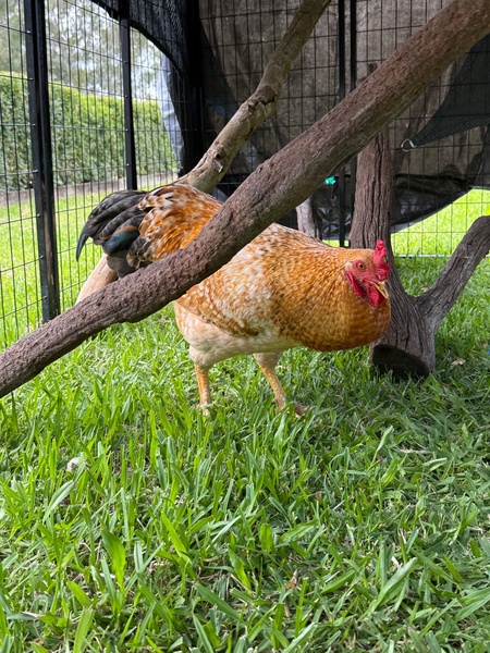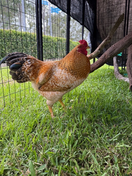 Egg Sheeran is the rare rooster who can slip into an existing flock like he's been. He's friendly, respectful, and has a natural talent for keeping the vibe calm. Whether he's softly "singing" to himself, posing dramatically in the sun, or bro‑bonding with the other boys, he's pure joy to have around.
