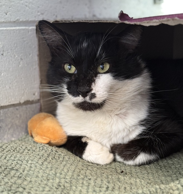 Meet our resident shy guy, Jasper! Jasper is a gentle black and white sweetheart who's hoping to find a calm, quiet home where he can truly blossom. 💕