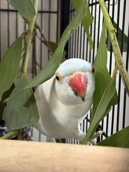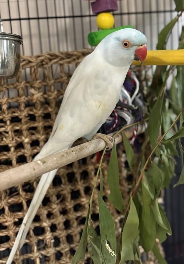 Meet Skye, a breathtaking Indian Ringneck with unique blue‑and‑white colouring that makes her truly stand out. 💙🤍