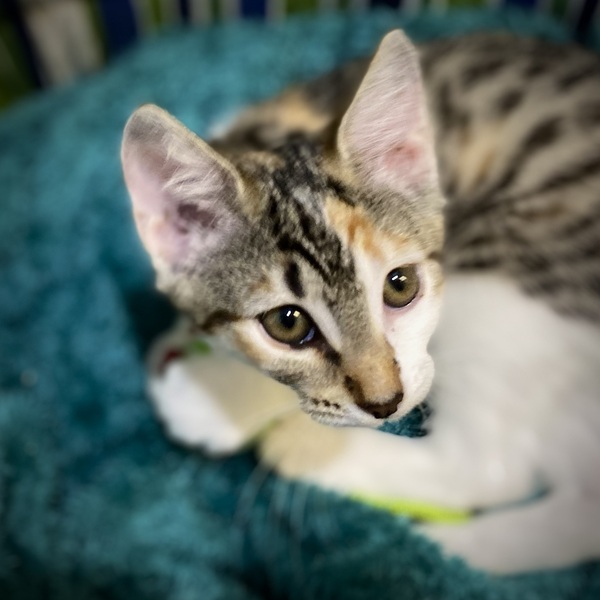 Please meet our Piglet! This little girl doesn't do anything by halves as she plays and loves hard. Piglet has loads and loads of energy to zoom around your house most of the day. After expending all her energy, Piglet will need time to rest and that's when she'll be a gentle little darling who'll rest in your arms for cuddles. We are still learning about Piglet and her nature. She has the most amazing fur colours and patterns - she has a beautiful, brown-torbie and white fur coat with blackish stripes and spots. She only has eyeliner on one eye, no doubt because she became distracted before finishing the other eye. Please read on for her care:-