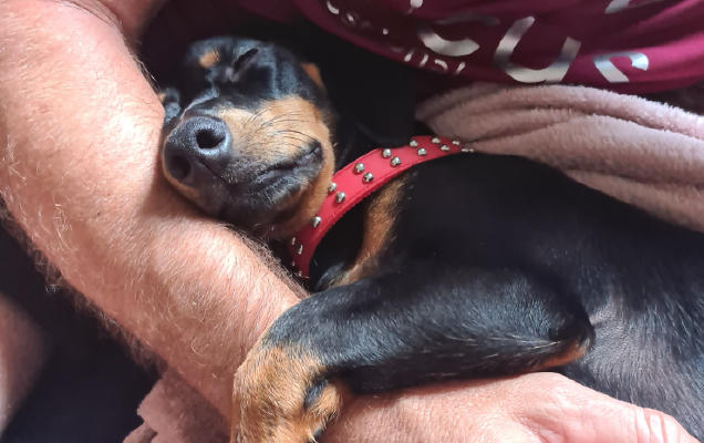 Now she enjoys two walks a day, learning new tricks, playing with her next-door neighbour Bowie, destroying an endless supply of toys, and getting lots of cuddles!