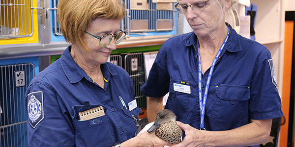 A surviving grey teal with RSPCA rescuers Mary and Barb