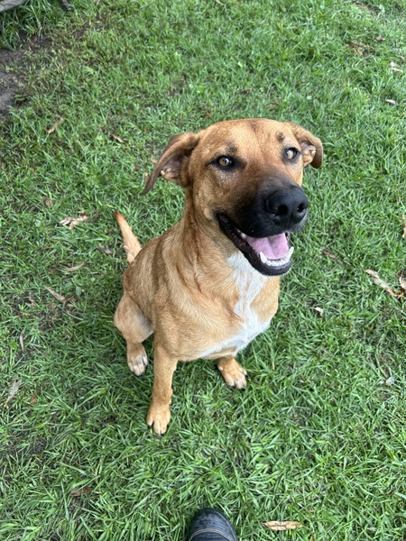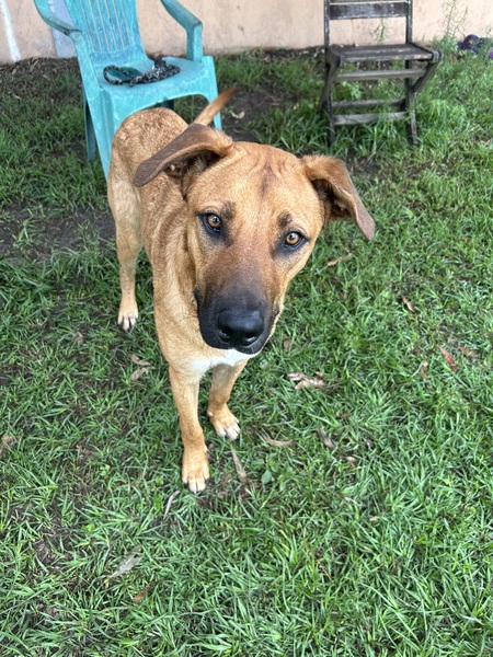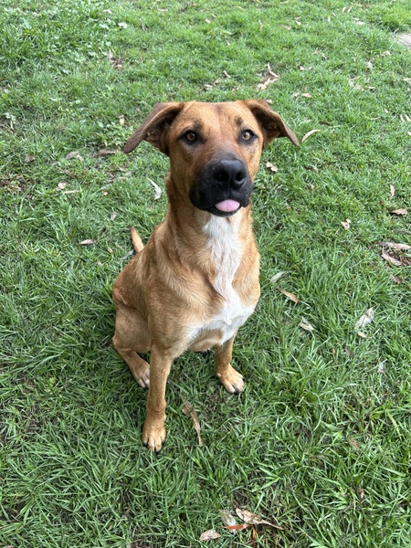 He's a big, bouncy youngster who doesn't always know his size, so the whole family must be involved in his continued training. He should be the only dog in the home for now, and all family members must meet him at adoption.