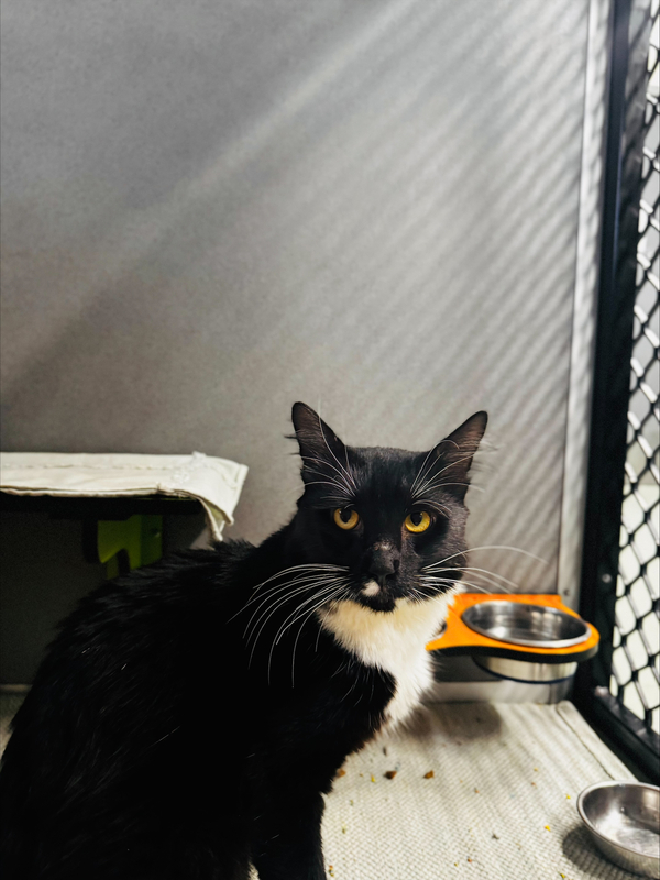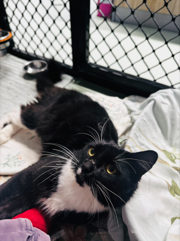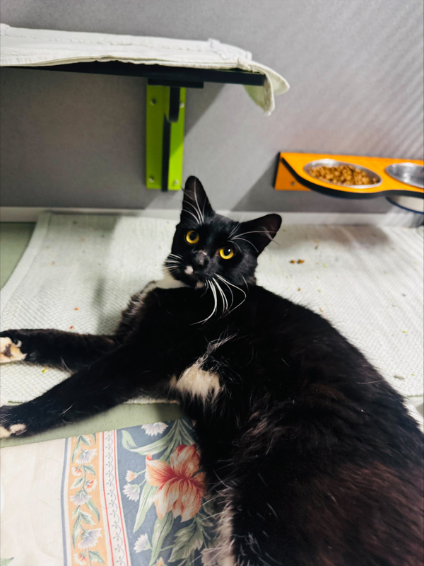 He gets along beautifully with other cats and has even helped a scared little kitten learn to eat and feel safe. He's happy to share food and space, as long as other cats respect his back‑end boundaries. He's not very interested in toys right now, but with love and a peaceful home, that may change.