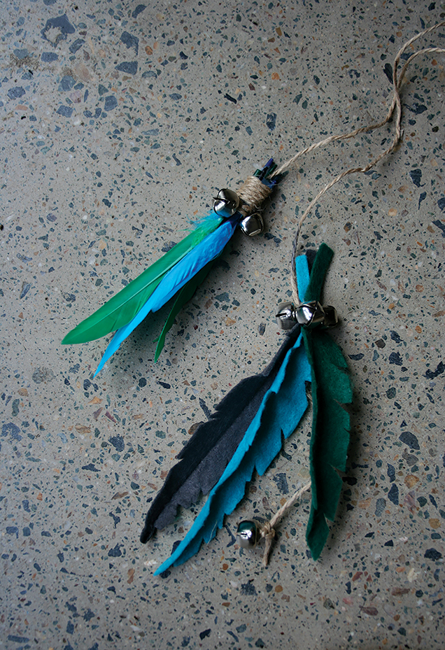 - Thread three bells onto the end of a long piece of twine and tie and knot the twine tightly