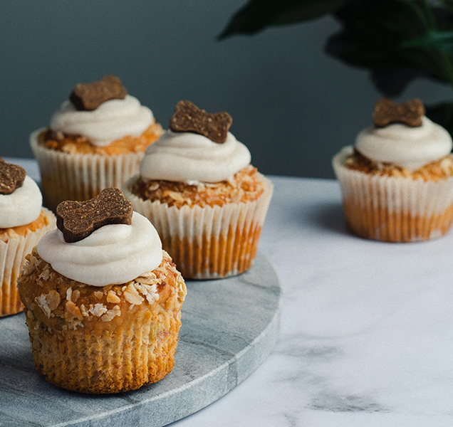 To decorate the pupcakes, use healthy ingredients your dog will love such as peanut butter! Or get creative and beat bananas and some oat flour to a frosting consistency and decorate with a dog treat or a blueberry on top of each!