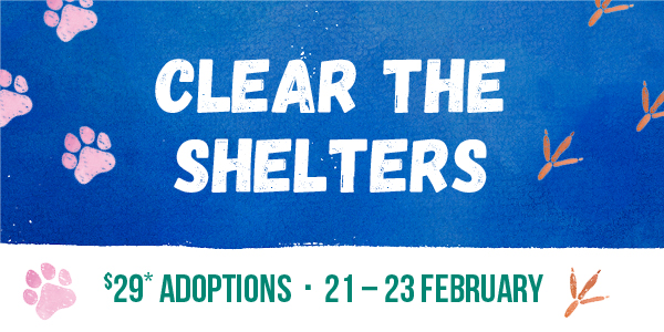 We are very excited to announce that from this Friday 21st February until Sunday 23th February, 2020 we are Clearing our Shelters across the state! All RSPCA animals available to adopt in Queensland will be just $29* to adopt. Read our FAQs for more detailed information.