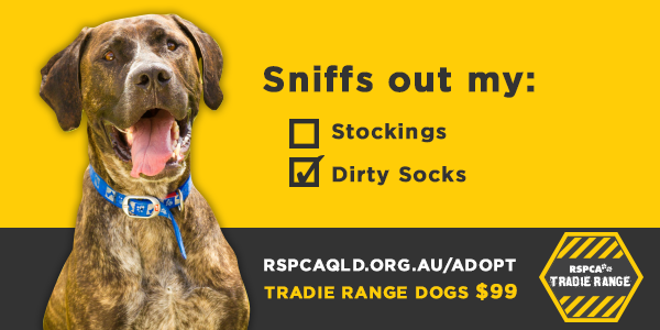 RSPCA Queensland shelters have been busy! Staff and volunteers have carefully selected dogs to suit the Aussie 'Tradie'. From November 23 until December 23, 'Tradie Range' dogs available to adopt at the RSPCA will be just $99!
