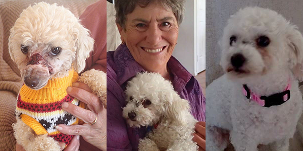 “Bebe’s owner had tied a band around the little dog’s mouth which was so embedded it had to be surgically removed. Her gums were bleeding when she was found and the area badly infected and smelly.”